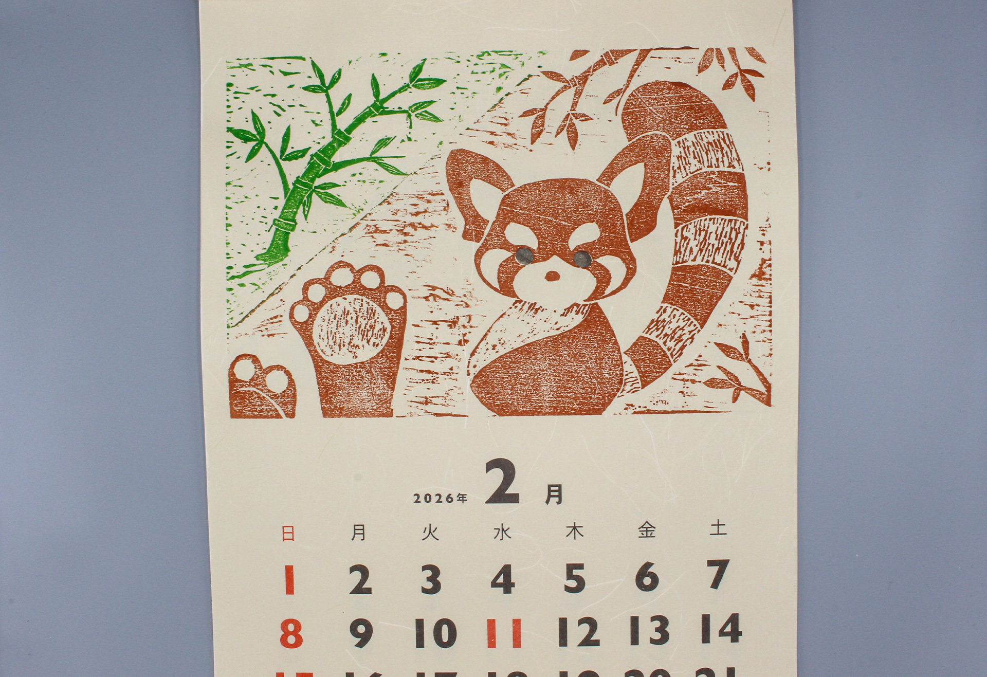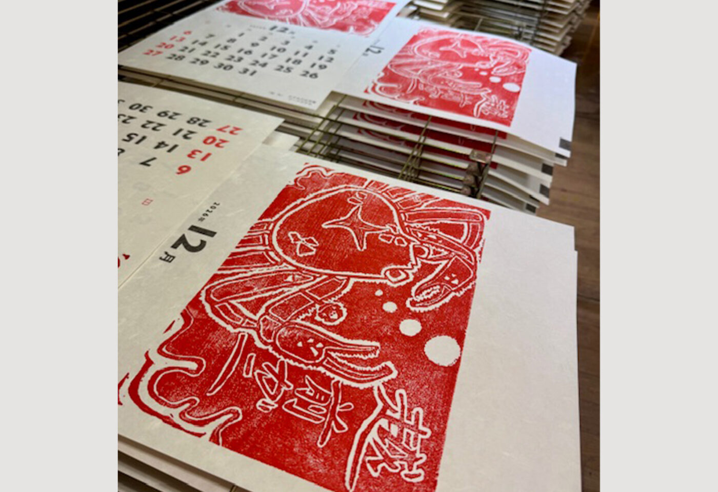 このカレンダーは社会福祉法人かすみが丘学園が、昭和56年から授産活動として製作を開始し、現在においても就労支援センターワークかすみにて、利用者が原画、版木、印刷、製本の各工程に携わり、製品化しています。