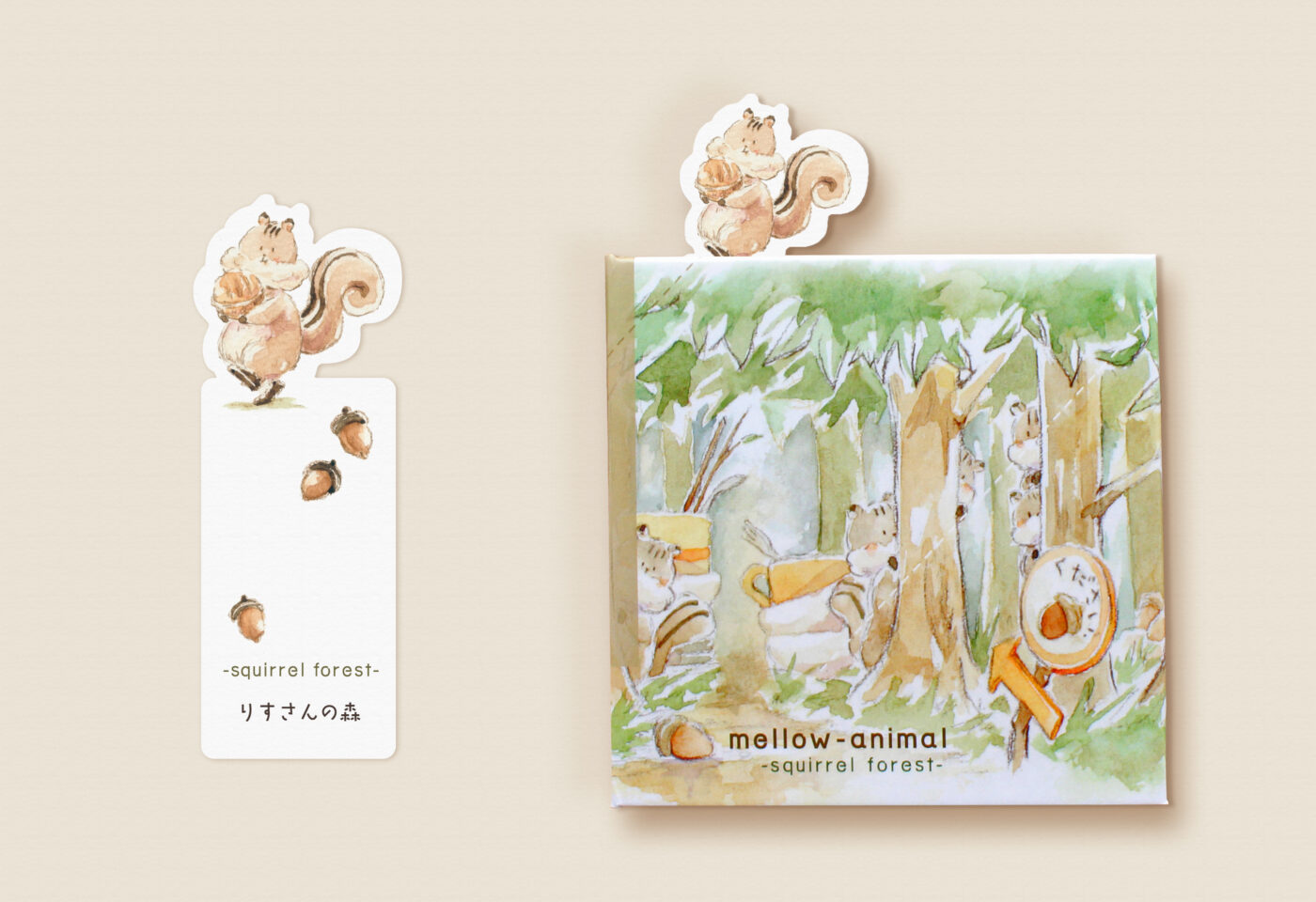 付属として栞がついているので、写真のように挟むと本からキャラクターが飛び出すデザインになっています。ちょっとしたアイディアや自分だけの物語を書いて、目印に挟んでいただければと思い、つけてみました。またハードカバーでしっかりとした手持ち感ながら、コンパクトなサイズなので持ち歩くのにもぴったりです。