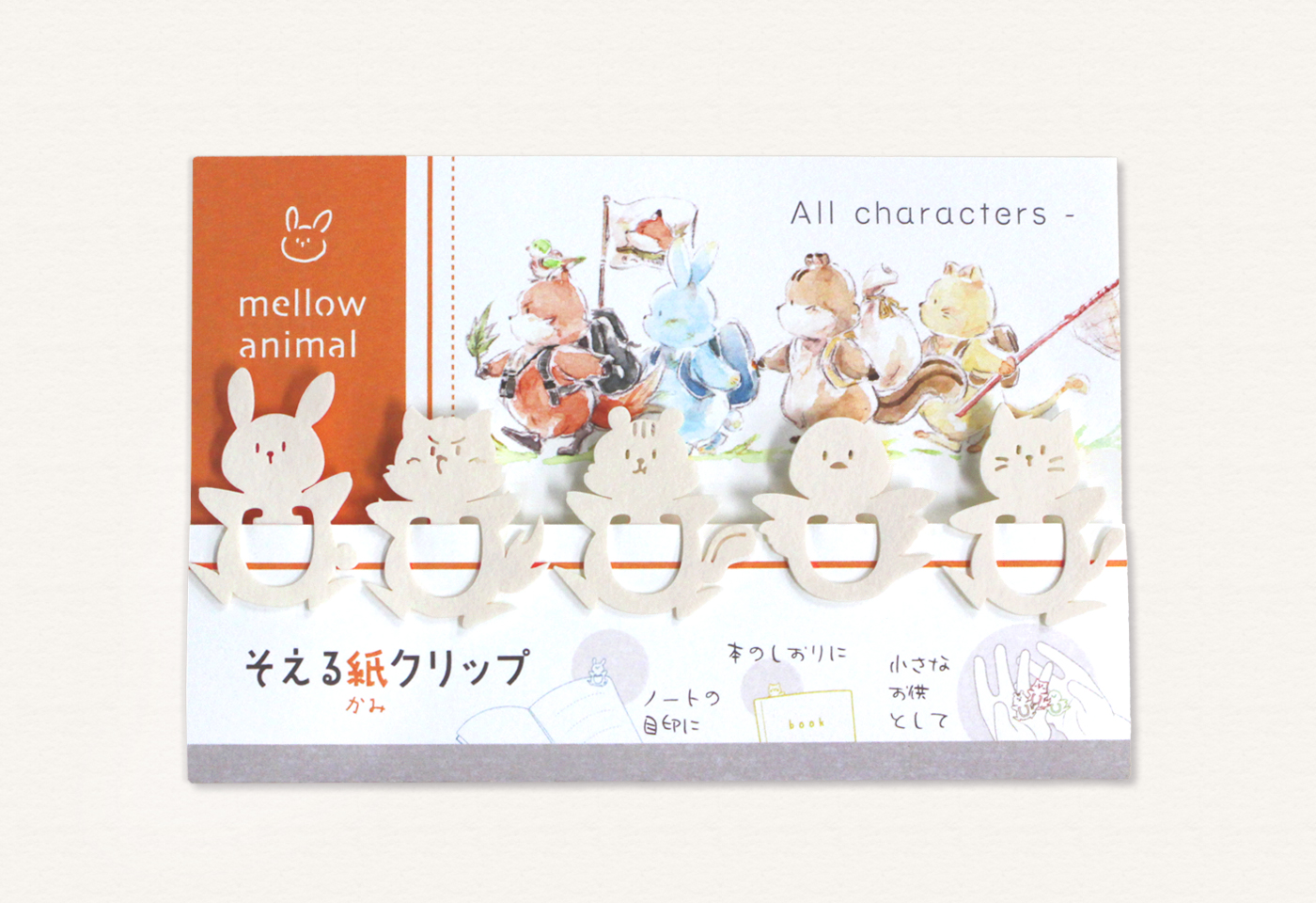 環境にも優しい素材を使用した紙クリップ。『メロウあにまる』のキャラクターたちとやさしく温もりのある触り心地を楽しんで下さい。全キャラクターが入った商品です。