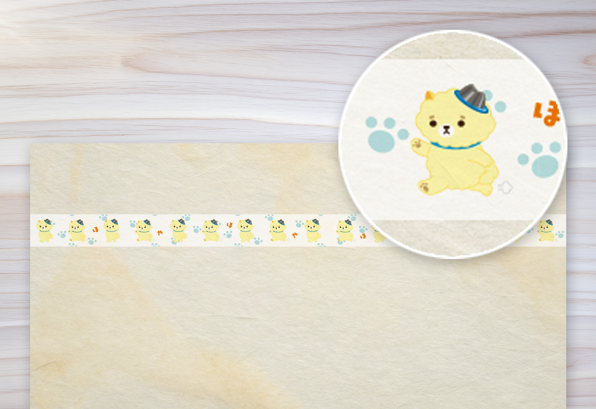 喜んだり、驚いたり、のんびりしたり。さまざまな表情のほや丸をテープ全体にレイアウトしました。引き出すたびに違う「キモチ」が現れる、遊び心のあるデザインです。