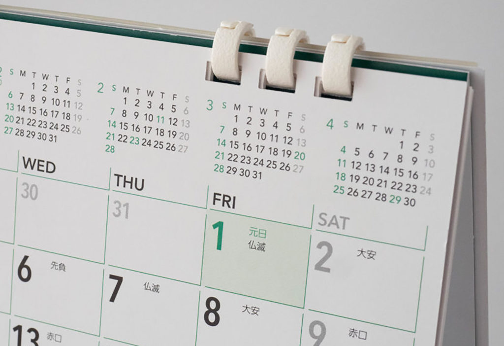 一般的なカレンダーでは文字色に赤や青がよく使われていますが、このエコカラーデイズはその名の通り、エコカラーである爽やかなグリーンを主にした、落ち着いた雰囲気のカレンダーです。オフィスでも家庭でも、どんなお部屋にもナチュラルにマッチします。